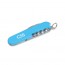 Kleines Taschenmesser mit 9 Funktionen: Kleine Klinge, Dosenöffner mit kleinem Schraubendreher, Kapselheber, Korkenzieher, Drahtabisolierer, Zahnstocher, Pinzette und Schlüsselring.
